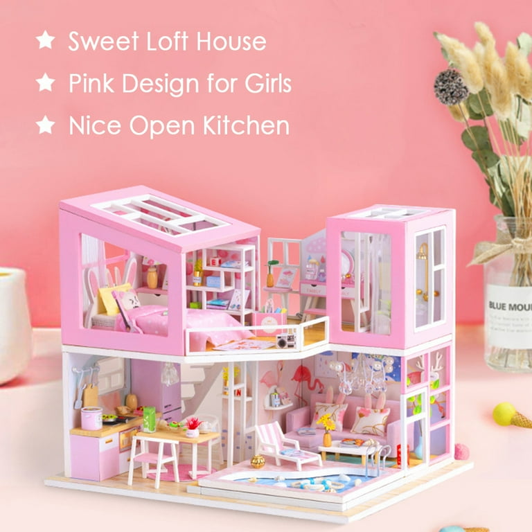 Miniature Doll House Diy Wooden Dollhouse With Furniture Pink Loft House Creative Gifts For 14 Adults Friends Family Walmart Com
